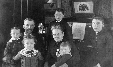 From left to right: Frederick T. Sibson, Jr., Frederick T. Sibson, Martha L. Sibson, Clarance W. Sibson (in back), Fredericka (Whittlesey) Sibson, Jack G. Sibson (baby), Pearl Sibson Back